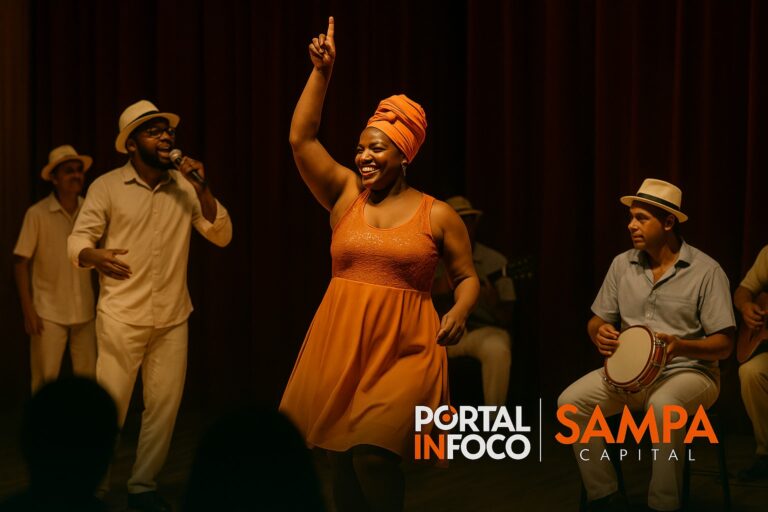 O espetáculo “O Território do Samba” será apresentado no domingo, 16 de novembro de 2025, às 19h, no Teatro Paulo Eiró, em Santo Amaro (Zona Sul de São Paulo). A montagem acompanha os dilemas internos de uma escola de samba diante das tensões entre preservar a tradição e incorporar novas propostas criativas.